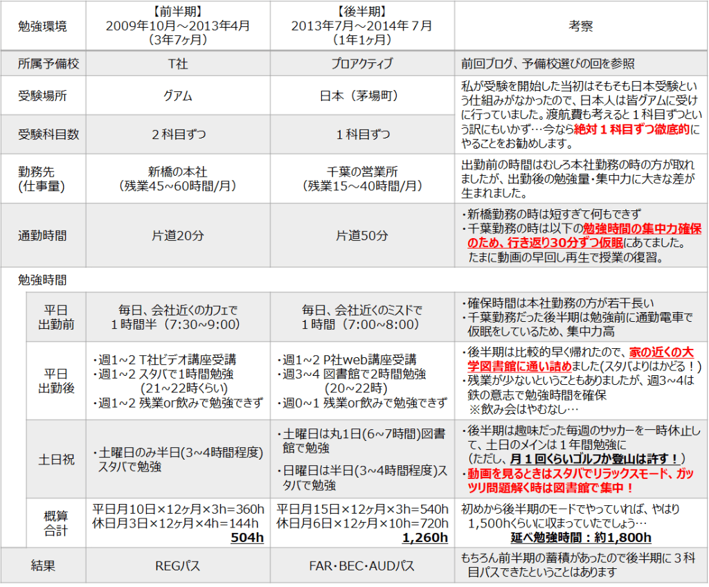 前回少し触れましたが(受験に向けた予備校選びと勉強法<2020年7月6日>)、私の場合は最初の予備校T社に入学(2009年10月)してからREGにパス(2013年4月)するまでに実に3年7ヶ月掛かりました。その後、プロアクティブに入学(2013年7月)してからFAR・BECさらに最終科目のAUDにパス(2014年7月)までが1年でしたので、延べ約5年です。ただ、最初の3年7ヶ月と最後の1年はまさに勉強環境が大きく違いました。前半期と後半期に分けた比較表がこちらです。