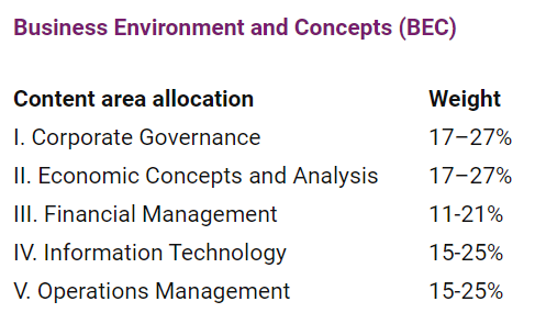 まずBECはわかりやすいです。左図はAICPAが公表しているExam sectionの紹介ですが、このうち「Ⅴ.Operations Management」が工業簿記でいうところの個別原価計算・CVP分析、標準原価計算などの管理会計(financial accounting)を含んでおり、BEC全体の15~20%程度の範囲に工業簿記の学力が効くと言えます。